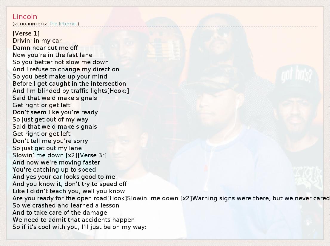[Verse 1] Drivin' in my car Damn near cut me off Now you're in the fast lane So you better not slow me down And I refuse to change my direction So you best make up your mind Before I get caught in the intersection And I'm blinded by traffic lights[Hook:] Said that we'd make signals Get right or get left Don't seem like you're ready So just get out of my way Said that we'd make signals Get right or get left Don't tell me you're sorry So just get out my lane Slowin' me down [x2][Verse 3:] And now we're moving faster You're catching up to speed And yes your car looks good to me And you know it, don't try to speed off Like I didn't teach you, well you know Are you ready for the open road[Hook]Slowin' me down [x2]Warning signs were there, but we never cared So we crashed and learned a lesson And to take care of the damage We need to admit that accidents happen So if it's cool with you, I'll just be on my way:
