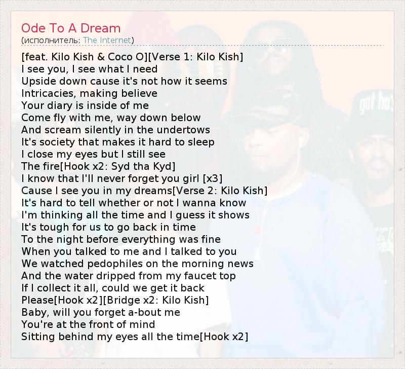 [feat. Kilo Kish & Coco O][Verse 1: Kilo Kish] I see you, I see what I need Upside down cause it's not how it seems Intricacies, making believe Your diary is inside of me Come fly with me, way down below And scream silently in the undertows It's society that makes it hard to sleep I close my eyes but I still see The fire[Hook x2: Syd tha Kyd] I know that I'll never forget you girl [x3] Cause I see you in my dreams[Verse 2: Kilo Kish] It's hard to tell whether or not I wanna know I'm thinking all the time and I guess it shows It's tough for us to go back in time To the night before everything was fine When you talked to me and I talked to you We watched pedophiles on the morning news And the water dripped from my faucet top If I collect it all, could we get it back Please[Hook x2][Bridge x2: Kilo Kish] Baby, will you forget a-bout me You're at the front of mind Sitting behind my eyes all the time[Hook x2]
