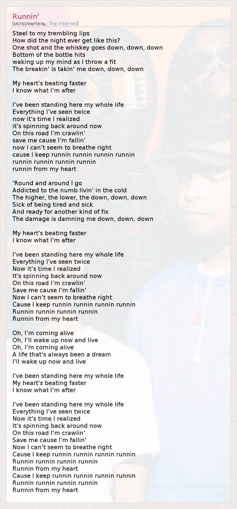 Steel to my trembling lips How did the night ever get like this? One shot and the whiskey goes down, down, down Bottom of the bottle hits waking up my mind as I throw a fit The breakin' is takin' me down, down, down My heart's beating faster I know what I'm after I've been standing here my whole life Everything I've seen twice now it's time I realized it's spinning back around now On this road I'm crawlin' save me cause I'm fallin' now I can't seem to breathe right cause I keep runnin runnin runnin runnin runnin runnin runnin runnin runnin from my heart 'Round and around I go Addicted to the numb livin' in the cold The higher, the lower, the down, down, down Sick of being tired and sick And ready for another kind of fix The damage is damning me down, down, down My heart's beating faster I know what I'm after I've been standing here my whole life Everything I've seen twice Now it's time I realized It's spinning back around now On this road I'm crawlin' Save me cause I'm fallin' Now I can't seem to breathe right Cause I keep runnin runnin runnin runnin Runnin runnin runnin runnin Runnin from my heart Oh, I'm coming alive Oh, I'll wake up now and live Oh, I'm coming alive A life that's always been a dream I'll wake up now and live I've been standing here my whole life My heart's beating faster I know what I'm after I've been standing here my whole life Everything I've seen twice Now it's time I realized It's spinning back around now On this road I'm crawlin' Save me cause I'm fallin' Now I can't seem to breathe right Cause I keep runnin runnin runnin runnin Runnin runnin runnin runnin Runnin from my heart Cause I keep runnin runnin runnin runnin Runnin runnin runnin runnin Runnin from my heart