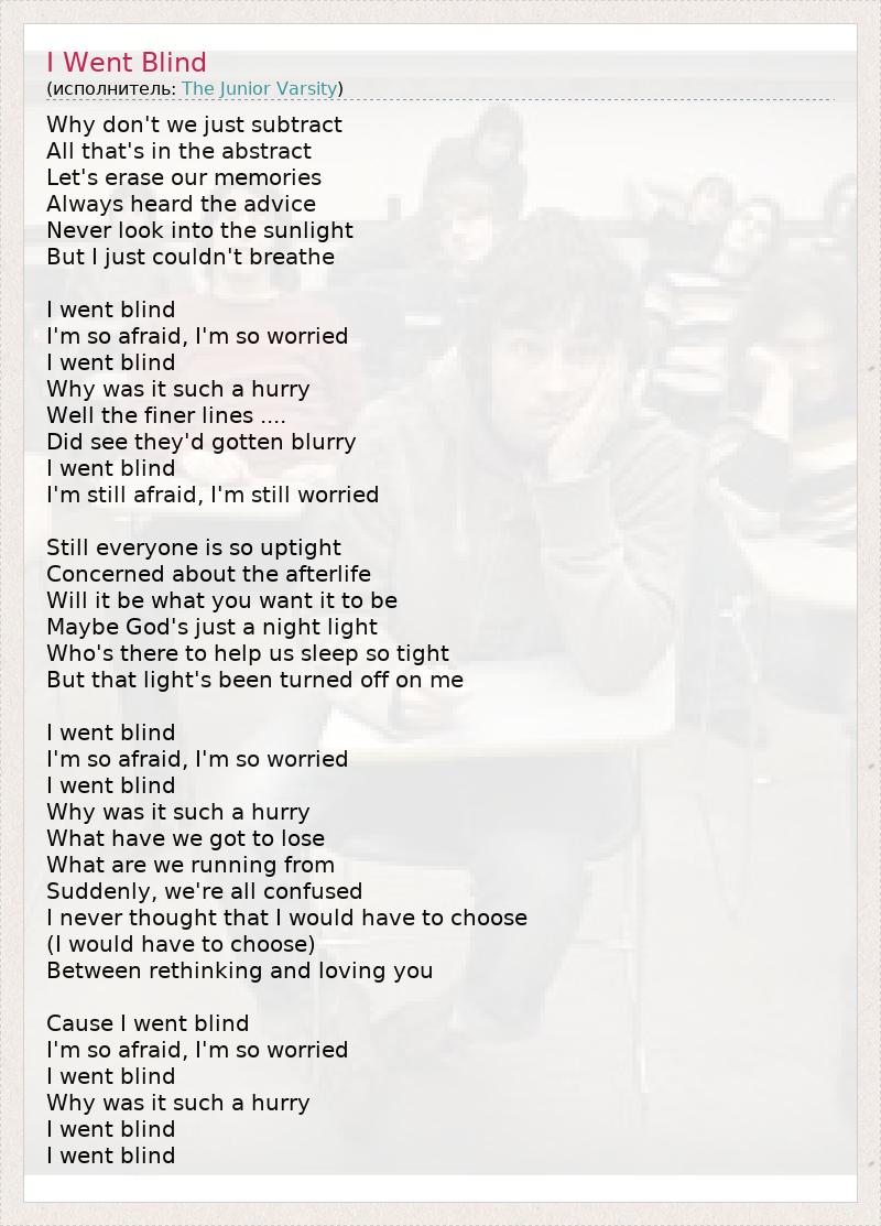 Why don't we just subtract All that's in the abstract Let's erase our memories Always heard the advice Never look into the sunlight But I just couldn't breathe I went blind I'm so afraid, I'm so worried I went blind Why was it such a hurry Well the finer lines .... Did see they'd gotten blurry I went blind I'm still afraid, I'm still worried Still everyone is so uptight Concerned about the afterlife Will it be what you want it to be Maybe God's just a night light Who's there to help us sleep so tight But that light's been turned off on me I went blind I'm so afraid, I'm so worried I went blind Why was it such a hurry What have we got to lose What are we running from Suddenly, we're all confused I never thought that I would have to choose (I would have to choose) Between rethinking and loving you Cause I went blind I'm so afraid, I'm so worried I went blind Why was it such a hurry I went blind I went blind