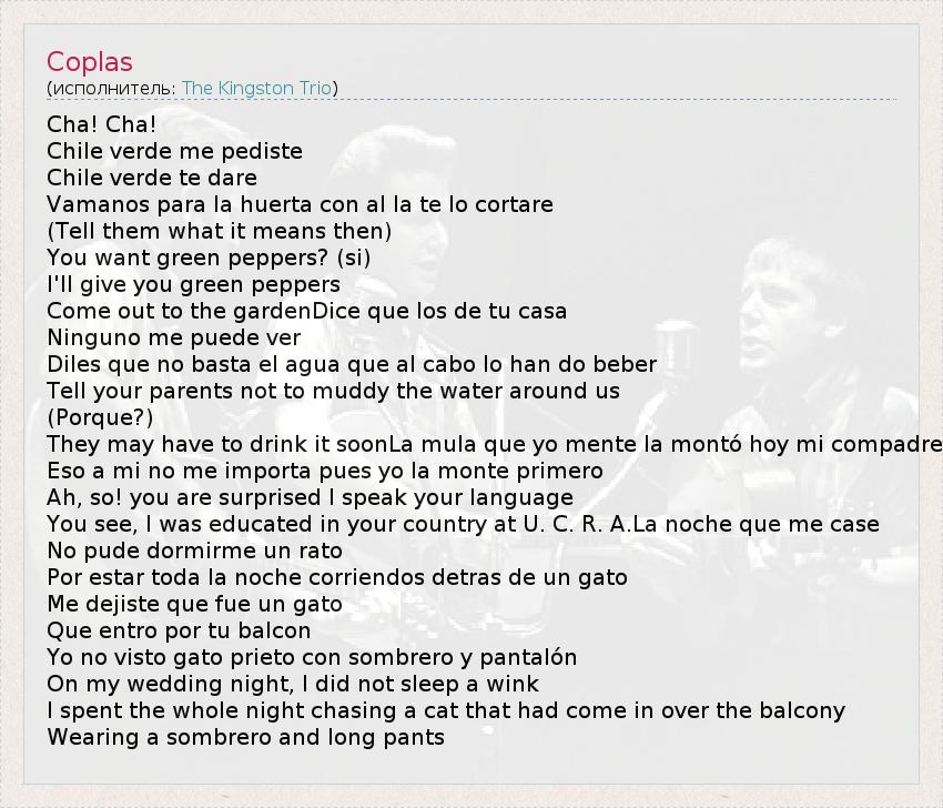 Cha! Cha! Chile verde me pediste Chile verde te dare Vamanos para la huerta con al la te lo cortare (Tell them what it means then) You want green peppers? (si) I'll give you green peppers Come out to the gardenDice que los de tu casa Ninguno me puede ver Diles que no basta el agua que al cabo lo han do beber Tell your parents not to muddy the water around us (Porque?) They may have to drink it soonLa mula que yo mente la montó hoy mi compadre Eso a mi no me importa pues yo la monte primero Ah, so! you are surprised I speak your language You see, I was educated in your country at U. C. R. A.La noche que me case No pude dormirme un rato Por estar toda la noche corriendos detras de un gato Me dejiste que fue un gato Que entro por tu balcon Yo no visto gato prieto con sombrero y pantalón On my wedding night, I did not sleep a wink I spent the whole night chasing a cat that had come in over the balcony Wearing a sombrero and long pants