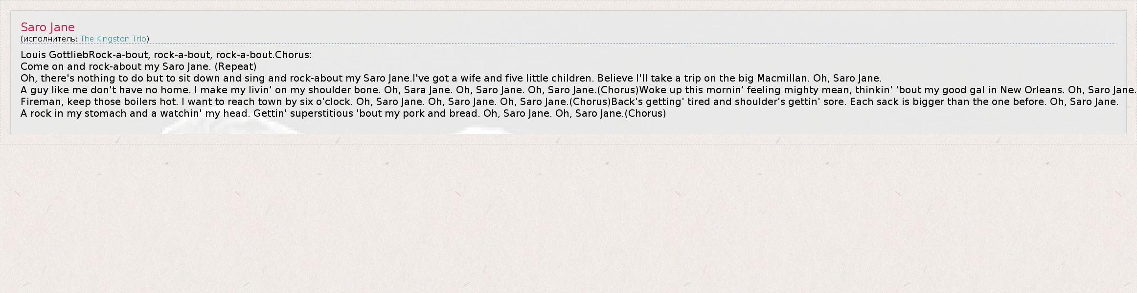 Louis GottliebRock-a-bout, rock-a-bout, rock-a-bout.Chorus: Come on and rock-about my Saro Jane. (Repeat) Oh, there's nothing to do but to sit down and sing and rock-about my Saro Jane.I've got a wife and five little children. Believe I'll take a trip on the big Macmillan. Oh, Saro Jane. A guy like me don't have no home. I make my livin' on my shoulder bone. Oh, Sara Jane. Oh, Saro Jane. Oh, Saro Jane.(Chorus)Woke up this mornin' feeling mighty mean, thinkin' 'bout my good gal in New Orleans. Oh, Saro Jane. Fireman, keep those boilers hot. I want to reach town by six o'clock. Oh, Saro Jane. Oh, Saro Jane. Oh, Saro Jane.(Chorus)Back's getting' tired and shoulder's gettin' sore. Each sack is bigger than the one before. Oh, Saro Jane. A rock in my stomach and a watchin' my head. Gettin' superstitious 'bout my pork and bread. Oh, Saro Jane. Oh, Saro Jane.(Chorus)