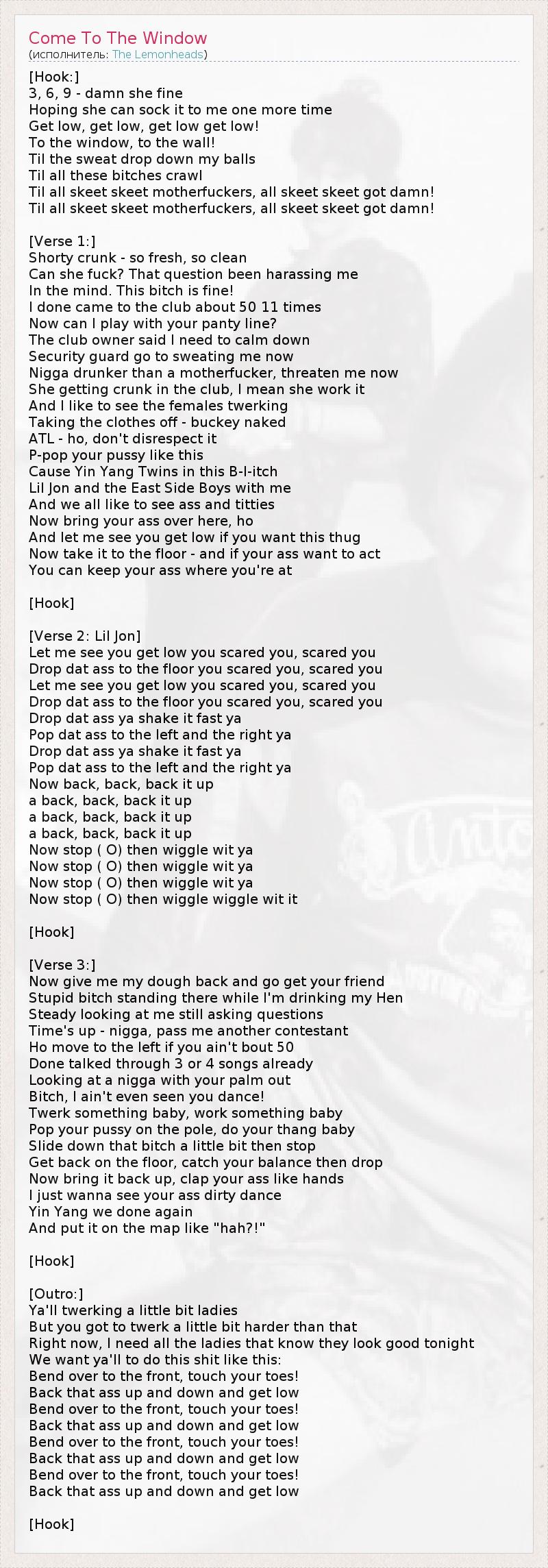 [Hook:] 3, 6, 9 - damn she fine Hoping she can sock it to me one more time Get low, get low, get low get low! To the window, to the wall! Til the sweat drop down my balls Til all these bitches crawl Til all skeet skeet motherfuckers, all skeet skeet got damn! Til all skeet skeet motherfuckers, all skeet skeet got damn! [Verse 1:] Shorty crunk - so fresh, so clean Can she fuck? That question been harassing me In the mind. This bitch is fine! I done came to the club about 50 11 times Now can I play with your panty line? The club owner said I need to calm down Security guard go to sweating me now Nigga drunker than a motherfucker, threaten me now She getting crunk in the club, I mean she work it And I like to see the females twerking Taking the clothes off - buckey naked ATL - ho, don't disrespect it P-pop your pussy like this Cause Yin Yang Twins in this B-I-itch Lil Jon and the East Side Boys with me And we all like to see ass and titties Now bring your ass over here, ho And let me see you get low if you want this thug Now take it to the floor - and if your ass want to act You can keep your ass where you're at [Hook] [Verse 2: Lil Jon] Let me see you get low you scared you, scared you Drop dat ass to the floor you scared you, scared you Let me see you get low you scared you, scared you Drop dat ass to the floor you scared you, scared you Drop dat ass ya shake it fast ya Pop dat ass to the left and the right ya Drop dat ass ya shake it fast ya Pop dat ass to the left and the right ya Now back, back, back it up a back, back, back it up a back, back, back it up a back, back, back it up Now stop ( O) then wiggle wit ya Now stop ( O) then wiggle wit ya Now stop ( O) then wiggle wit ya Now stop ( O) then wiggle wiggle wit it [Hook] [Verse 3:] Now give me my dough back and go get your friend Stupid bitch standing there while I'm drinking my Hen Steady looking at me still asking questions Time's up - nigga, pass me another contestant Ho move to the left if you ain't bout 50 Done talked through 3 or 4 songs already Looking at a nigga with your palm out Bitch, I ain't even seen you dance! Twerk something baby, work something baby Pop your pussy on the pole, do your thang baby Slide down that bitch a little bit then stop Get back on the floor, catch your balance then drop Now bring it back up, clap your ass like hands I just wanna see your ass dirty dance Yin Yang we done again And put it on the map like "hah?!" [Hook] [Outro:] Ya'll twerking a little bit ladies But you got to twerk a little bit harder than that Right now, I need all the ladies that know they look good tonight We want ya'll to do this shit like this: Bend over to the front, touch your toes! Back that ass up and down and get low Bend over to the front, touch your toes! Back that ass up and down and get low Bend over to the front, touch your toes! Back that ass up and down and get low Bend over to the front, touch your toes! Back that ass up and down and get low [Hook]