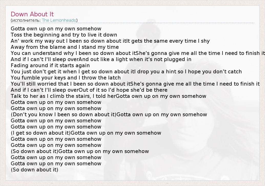 Gotta own up on my own somehow Toss the beginning and try to live it down An' work my way out I been so down about itIt gets the same every time I shy Away from the blame and I stand my time You can understand why I been so down about itShe's gonna give me all the time I need to finish it And if I can't I'll sleep overAnd out like a light when it's not plugged in Fading around if it starts again You just don't get it when I get so down about itI drop you a hint so I hope you don't catch You fumble your keys and I throw the latch You'll still worried that I been so down about itShe's gonna give me all the time I need to finish it And if I can't I'll sleep overOut of it so I'd hope she'd be there Talk to her as I climb the stairs, I told herGotta own up on my own somehow Gotta own up on my own somehow Gotta own up on my own somehow (Don't you know I been so down about it)Gotta own up on my own somehow Gotta own up on my own somehow Gotta own up on my own somehow (I get so down about it)Gotta own up on my own somehow Gotta own up on my own somehow Gotta own up on my own somehow (So down about it)Gotta own up on my own somehow Gotta own up on my own somehow Gotta own up on my own somehow (So down about it)