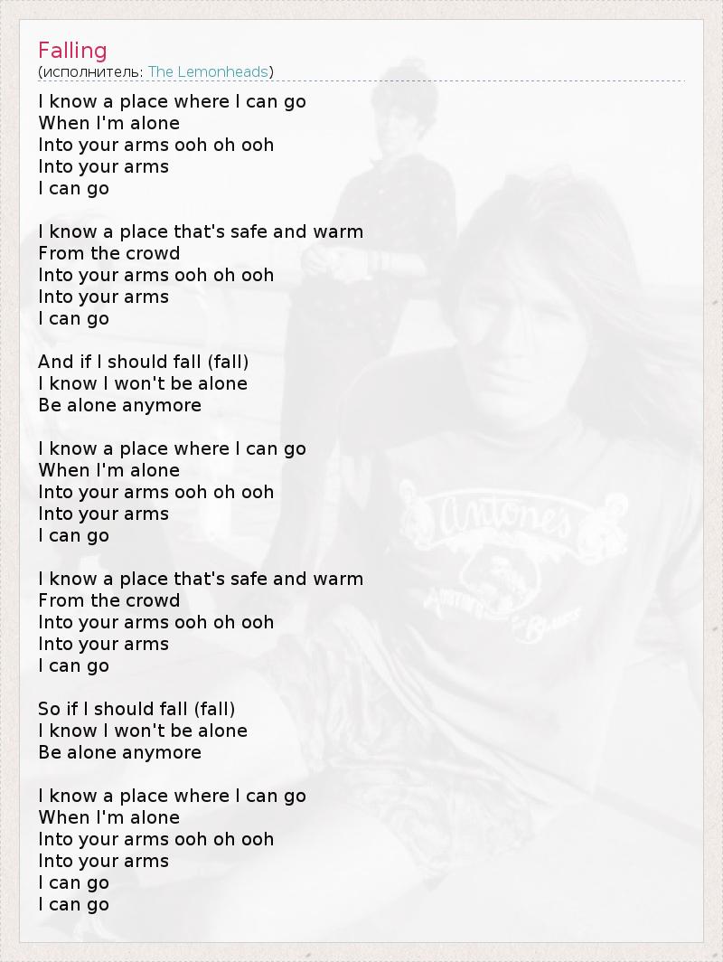I know a place where I can go When I'm alone Into your arms ooh oh ooh Into your arms I can go I know a place that's safe and warm From the crowd Into your arms ooh oh ooh Into your arms I can go And if I should fall (fall) I know I won't be alone Be alone anymore I know a place where I can go When I'm alone Into your arms ooh oh ooh Into your arms I can go I know a place that's safe and warm From the crowd Into your arms ooh oh ooh Into your arms I can go So if I should fall (fall) I know I won't be alone Be alone anymore I know a place where I can go When I'm alone Into your arms ooh oh ooh Into your arms I can go I can go