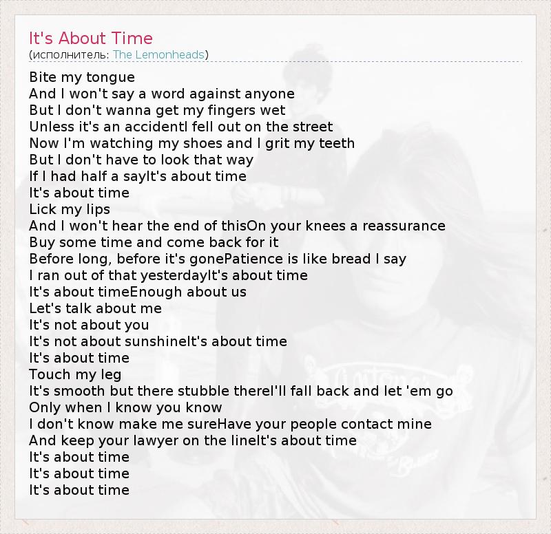 Bite my tongue And I won't say a word against anyone But I don't wanna get my fingers wet Unless it's an accidentI fell out on the street Now I'm watching my shoes and I grit my teeth But I don't have to look that way If I had half a sayIt's about time It's about time Lick my lips And I won't hear the end of thisOn your knees a reassurance Buy some time and come back for it Before long, before it's gonePatience is like bread I say I ran out of that yesterdayIt's about time It's about timeEnough about us Let's talk about me It's not about you It's not about sunshineIt's about time It's about time Touch my leg It's smooth but there stubble thereI'll fall back and let 'em go Only when I know you know I don't know make me sureHave your people contact mine And keep your lawyer on the lineIt's about time It's about time It's about time It's about time