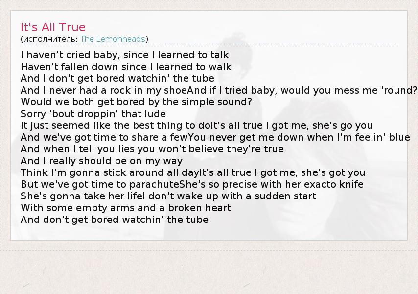 I haven't cried baby, since I learned to talk Haven't fallen down since I learned to walk And I don't get bored watchin' the tube And I never had a rock in my shoeAnd if I tried baby, would you mess me 'round? Would we both get bored by the simple sound? Sorry 'bout droppin' that lude It just seemed like the best thing to doIt's all true I got me, she's go you And we've got time to share a fewYou never get me down when I'm feelin' blue And when I tell you lies you won't believe they're true And I really should be on my way Think I'm gonna stick around all dayIt's all true I got me, she's got you But we've got time to parachuteShe's so precise with her exacto knife She's gonna take her lifeI don't wake up with a sudden start With some empty arms and a broken heart And don't get bored watchin' the tube