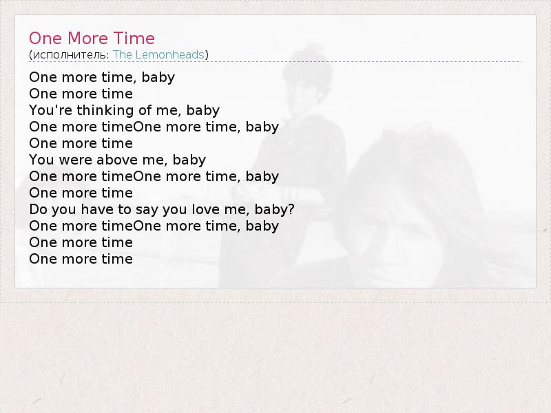 One more time, baby One more time You're thinking of me, baby One more timeOne more time, baby One more time You were above me, baby One more timeOne more time, baby One more time Do you have to say you love me, baby? One more timeOne more time, baby One more time One more time