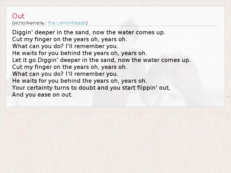 Diggin' deeper in the sand, now the water comes up. Cut my finger on the years oh, years oh. What can you do? I'll remember you. He waits for you behind the years oh, years oh. Let it go.Diggin' deeper in the sand, now the water comes up. Cut my finger on the years oh, years oh. What can you do? I'll remember you. He waits for you behind the years oh, years oh. Your certainty turns to doubt and you start flippin' out, And you ease on out.