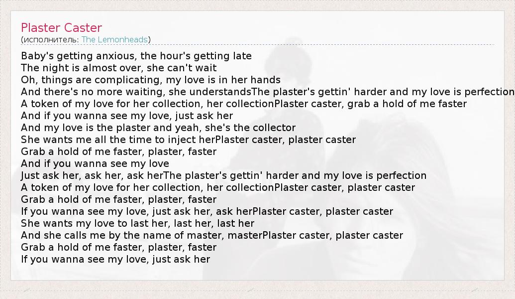 Baby's getting anxious, the hour's getting late The night is almost over, she can't wait Oh, things are complicating, my love is in her hands And there's no more waiting, she understandsThe plaster's gettin' harder and my love is perfection A token of my love for her collection, her collectionPlaster caster, grab a hold of me faster And if you wanna see my love, just ask her And my love is the plaster and yeah, she's the collector She wants me all the time to inject herPlaster caster, plaster caster Grab a hold of me faster, plaster, faster And if you wanna see my love Just ask her, ask her, ask herThe plaster's gettin' harder and my love is perfection A token of my love for her collection, her collectionPlaster caster, plaster caster Grab a hold of me faster, plaster, faster If you wanna see my love, just ask her, ask herPlaster caster, plaster caster She wants my love to last her, last her, last her And she calls me by the name of master, masterPlaster caster, plaster caster Grab a hold of me faster, plaster, faster If you wanna see my love, just ask her