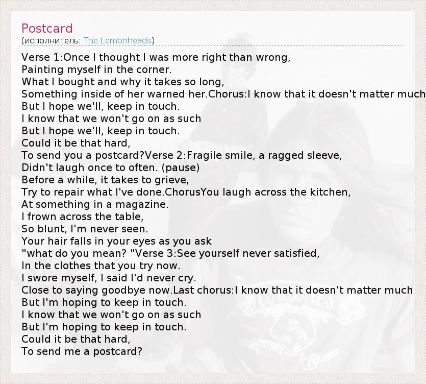 Verse 1:Once I thought I was more right than wrong, Painting myself in the corner. What I bought and why it takes so long, Something inside of her warned her.Chorus:I know that it doesn't matter much But I hope we'll, keep in touch. I know that we won't go on as such But I hope we'll, keep in touch. Could it be that hard, To send you a postcard?Verse 2:Fragile smile, a ragged sleeve, Didn't laugh once to often. (pause) Before a while, it takes to grieve, Try to repair what I've done.ChorusYou laugh across the kitchen, At something in a magazine. I frown across the table, So blunt, I'm never seen. Your hair falls in your eyes as you ask "what do you mean? "Verse 3:See yourself never satisfied, In the clothes that you try now. I swore myself, I said I'd never cry. Close to saying goodbye now.Last chorus:I know that it doesn't matter much But I'm hoping to keep in touch. I know that we won't go on as such But I'm hoping to keep in touch. Could it be that hard, To send me a postcard?