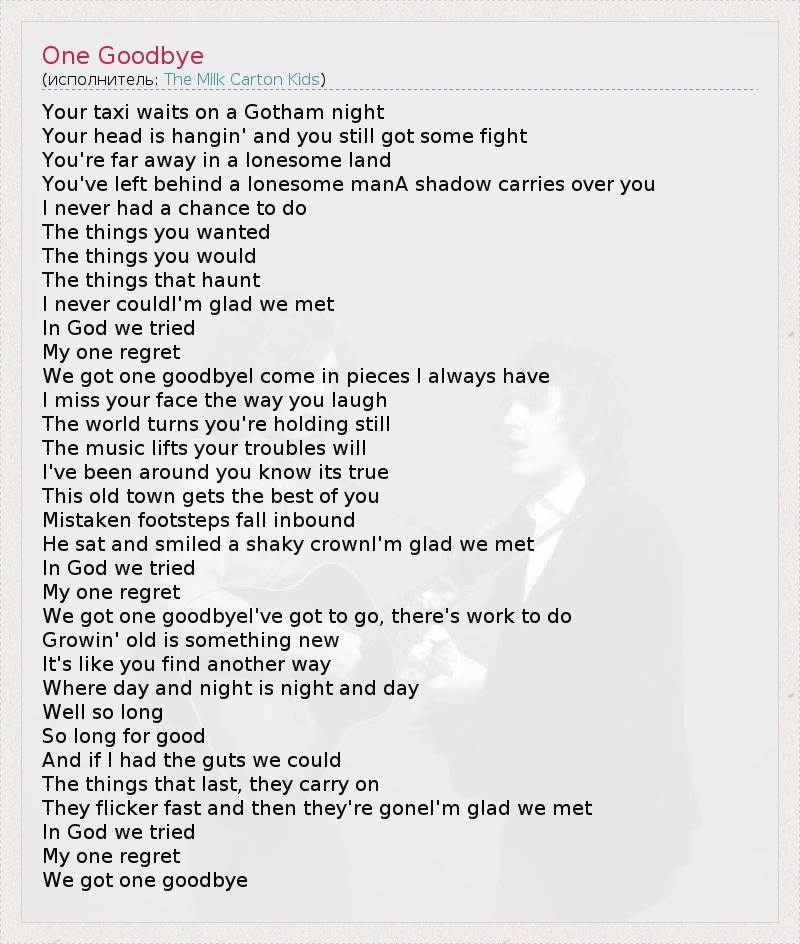 Your taxi waits on a Gotham night Your head is hangin' and you still got some fight You're far away in a lonesome land You've left behind a lonesome manA shadow carries over you I never had a chance to do The things you wanted The things you would The things that haunt I never couldI'm glad we met In God we tried My one regret We got one goodbyeI come in pieces I always have I miss your face the way you laugh The world turns you're holding still The music lifts your troubles will I've been around you know its true This old town gets the best of you Mistaken footsteps fall inbound He sat and smiled a shaky crownI'm glad we met In God we tried My one regret We got one goodbyeI've got to go, there's work to do Growin' old is something new It's like you find another way Where day and night is night and day Well so long So long for good And if I had the guts we could The things that last, they carry on They flicker fast and then they're goneI'm glad we met In God we tried My one regret We got one goodbye