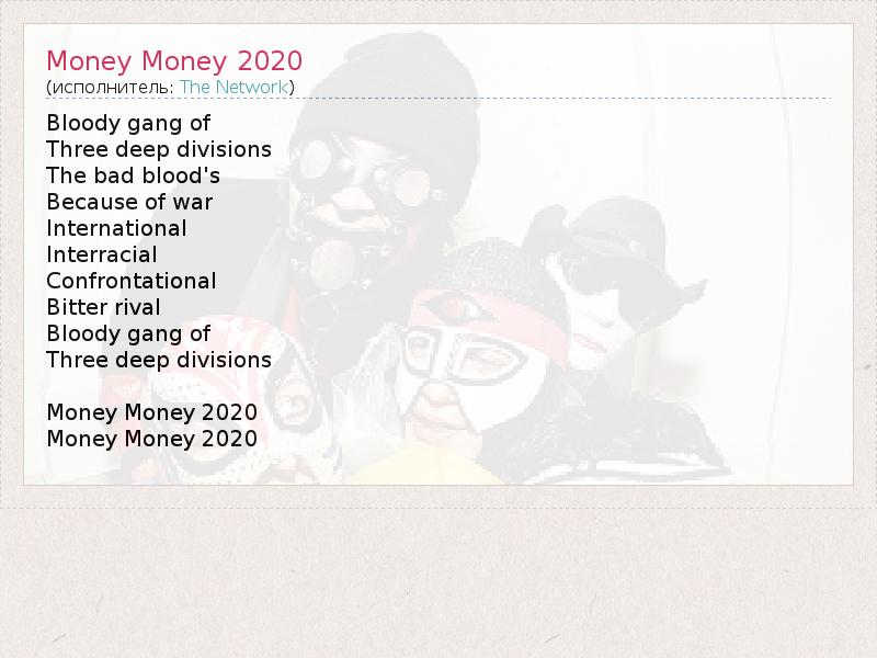 А как ты думаешь, о чем песня "Money Money 2020" ?