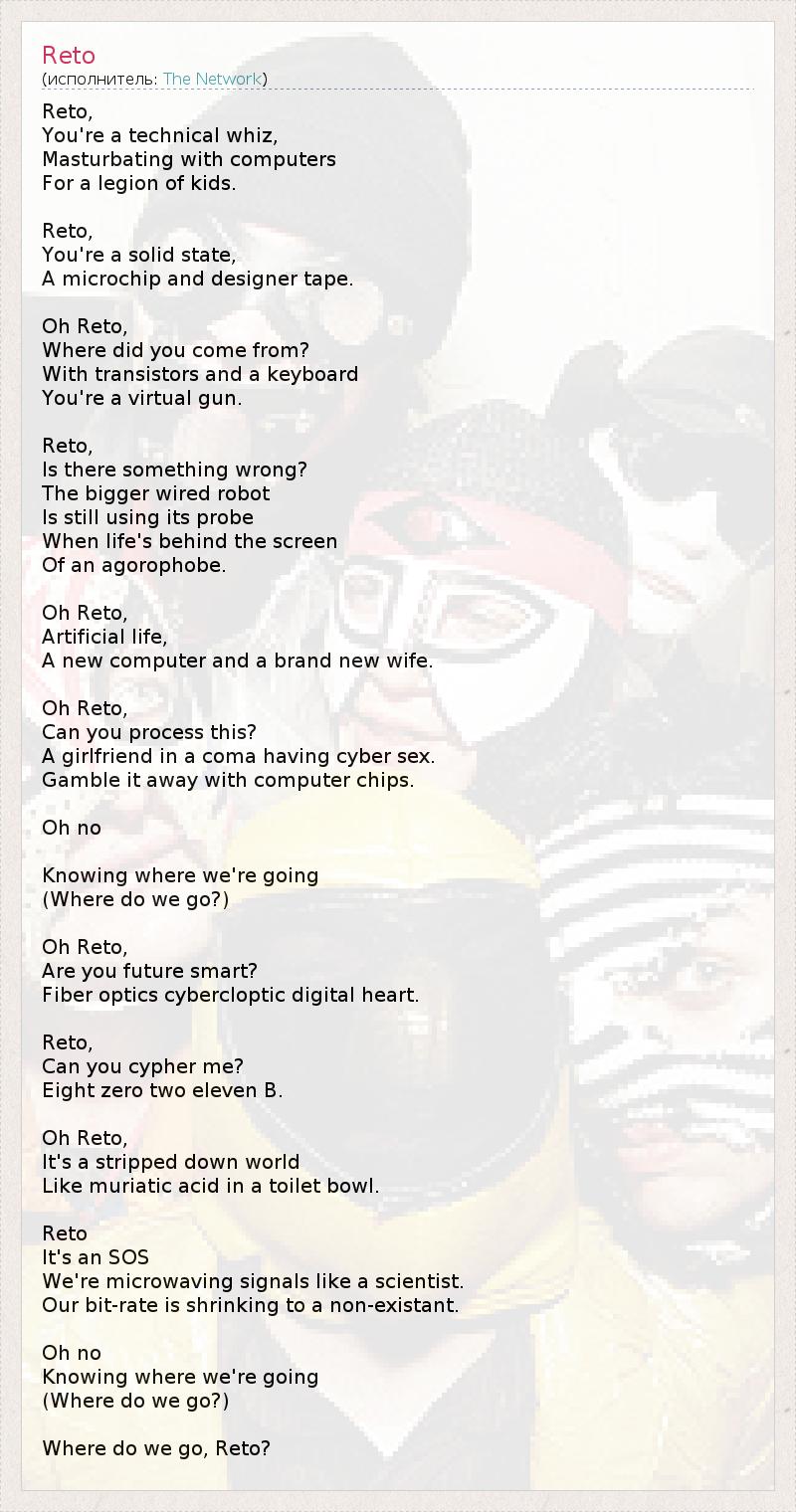 Reto, You're a technical whiz, Masturbating with computers For a legion of kids. Reto, You're a solid state, A microchip and designer tape. Oh Reto, Where did you come from? With transistors and a keyboard You're a virtual gun. Reto, Is there something wrong? The bigger wired robot Is still using its probe When life's behind the screen Of an agorophobe. Oh Reto, Artificial life, A new computer and a brand new wife. Oh Reto, Can you process this? A girlfriend in a coma having cyber sex. Gamble it away with computer chips. Oh no Knowing where we're going (Where do we go?) Oh Reto, Are you future smart? Fiber optics cybercloptic digital heart. Reto, Can you cypher me? Eight zero two eleven B. Oh Reto, It's a stripped down world Like muriatic acid in a toilet bowl. Reto It's an SOS We're microwaving signals like a scientist. Our bit-rate is shrinking to a non-existant. Oh no Knowing where we're going (Where do we go?) Where do we go, Reto?