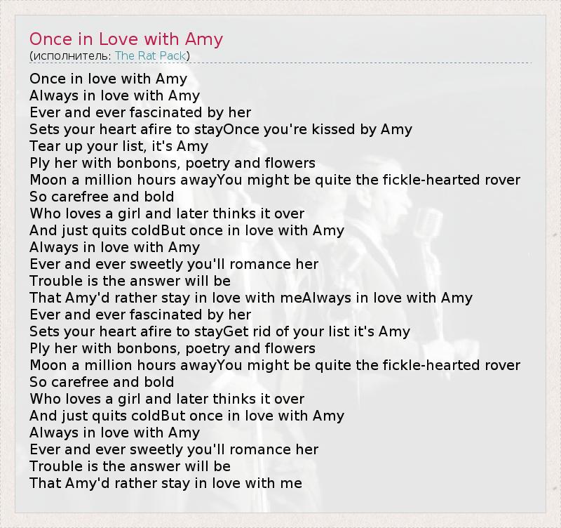 Once in love with Amy Always in love with Amy Ever and ever fascinated by her Sets your heart afire to stayOnce you're kissed by Amy Tear up your list, it's Amy Ply her with bonbons, poetry and flowers Moon a million hours awayYou might be quite the fickle-hearted rover So carefree and bold Who loves a girl and later thinks it over And just quits coldBut once in love with Amy Always in love with Amy Ever and ever sweetly you'll romance her Trouble is the answer will be That Amy'd rather stay in love with meAlways in love with Amy Ever and ever fascinated by her Sets your heart afire to stayGet rid of your list it's Amy Ply her with bonbons, poetry and flowers Moon a million hours awayYou might be quite the fickle-hearted rover So carefree and bold Who loves a girl and later thinks it over And just quits coldBut once in love with Amy Always in love with Amy Ever and ever sweetly you'll romance her Trouble is the answer will be That Amy'd rather stay in love with me