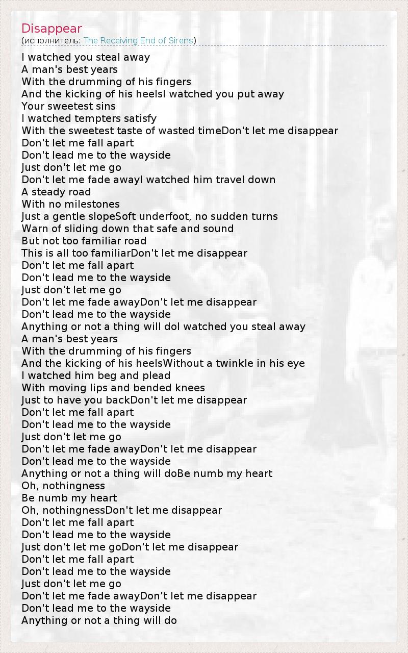 I watched you steal away A man's best years With the drumming of his fingers And the kicking of his heelsI watched you put away Your sweetest sins I watched tempters satisfy With the sweetest taste of wasted timeDon't let me disappear Don't let me fall apart Don't lead me to the wayside Just don't let me go Don't let me fade awayI watched him travel down A steady road With no milestones Just a gentle slopeSoft underfoot, no sudden turns Warn of sliding down that safe and sound But not too familiar road This is all too familiarDon't let me disappear Don't let me fall apart Don't lead me to the wayside Just don't let me go Don't let me fade awayDon't let me disappear Don't lead me to the wayside Anything or not a thing will doI watched you steal away A man's best years With the drumming of his fingers And the kicking of his heelsWithout a twinkle in his eye I watched him beg and plead With moving lips and bended knees Just to have you backDon't let me disappear Don't let me fall apart Don't lead me to the wayside Just don't let me go Don't let me fade awayDon't let me disappear Don't lead me to the wayside Anything or not a thing will doBe numb my heart Oh, nothingness Be numb my heart Oh, nothingnessDon't let me disappear Don't let me fall apart Don't lead me to the wayside Just don't let me goDon't let me disappear Don't let me fall apart Don't lead me to the wayside Just don't let me go Don't let me fade awayDon't let me disappear Don't lead me to the wayside Anything or not a thing will do