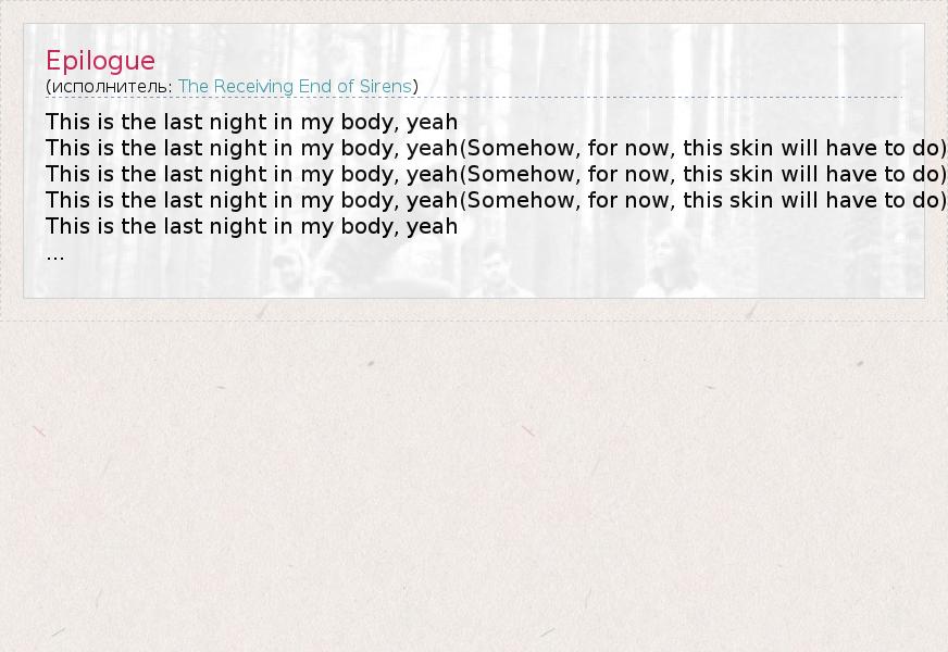 This is the last night in my body, yeah This is the last night in my body, yeah(Somehow, for now, this skin will have to do) This is the last night in my body, yeah(Somehow, for now, this skin will have to do) This is the last night in my body, yeah(Somehow, for now, this skin will have to do) This is the last night in my body, yeah ...