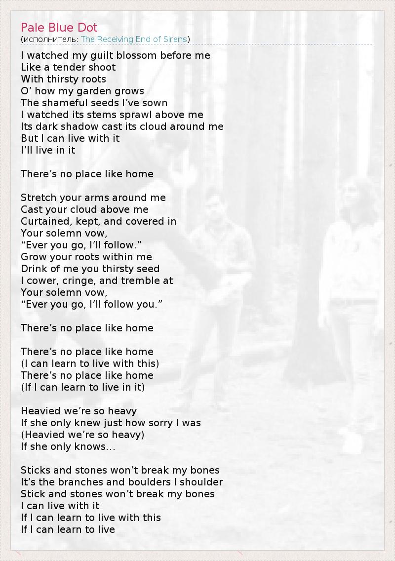 Я наблюдал свою вину цвести до меня Как отпрыск С жаждой корней O ' , как мой сад растет Позорные семена я посеянные Я смотрел его стебли разрастание выше меня Его темная тень отбрасывала облако вокруг меня Но я могу с этим жить Я буду жить в нем Там нет места, как дома Вытяните руки вокруг меня Отдайте свой облако выше меня Занавешены , хранится , и покрыты Ваш торжественно обещаю , "С тех ты уйдешь, я буду следовать . " Вырастить свои корни во мне Напиток из меня хочешь пить семя Я съеживаться , съеживаться , и трепещут в Ваш торжественно обещаю , "С тех ты уйдешь, я пойду за тобой . " Там нет места, как дома Там нет места, как дома ( Я могу научиться жить с этим ) Там нет места, как дома ( Если я могу научиться в нем жить ) Heavied мы так тяжело Если бы она только знала , насколько жаль, что я был ( Heavied мы настолько тяжелым) Если она знает ... Палки и камни не будут срывать мои кости Этофилиалы и валуны я плечо Придерживайтесь и камни не будет ломаться кости мои Я могу жить с ним Если я могу научиться жить с этим Если я могу научиться жить