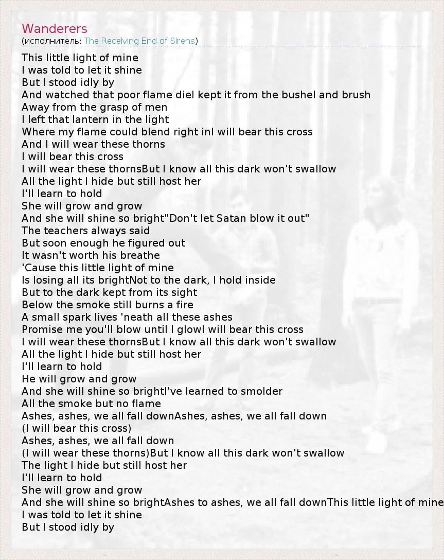 This little light of mine I was told to let it shine But I stood idly by And watched that poor flame dieI kept it from the bushel and brush Away from the grasp of men I left that lantern in the light Where my flame could blend right inI will bear this cross And I will wear these thorns I will bear this cross I will wear these thornsBut I know all this dark won't swallow All the light I hide but still host her I'll learn to hold She will grow and grow And she will shine so bright"Don't let Satan blow it out" The teachers always said But soon enough he figured out It wasn't worth his breathe 'Cause this little light of mine Is losing all its brightNot to the dark, I hold inside But to the dark kept from its sight Below the smoke still burns a fire A small spark lives 'neath all these ashes Promise me you'll blow until I glowI will bear this cross I will wear these thornsBut I know all this dark won't swallow All the light I hide but still host her I'll learn to hold He will grow and grow And she will shine so brightI've learned to smolder All the smoke but no flame Ashes, ashes, we all fall downAshes, ashes, we all fall down (I will bear this cross) Ashes, ashes, we all fall down (I will wear these thorns)But I know all this dark won't swallow The light I hide but still host her I'll learn to hold She will grow and grow And she will shine so brightAshes to ashes, we all fall downThis little light of mine I was told to let it shine But I stood idly by