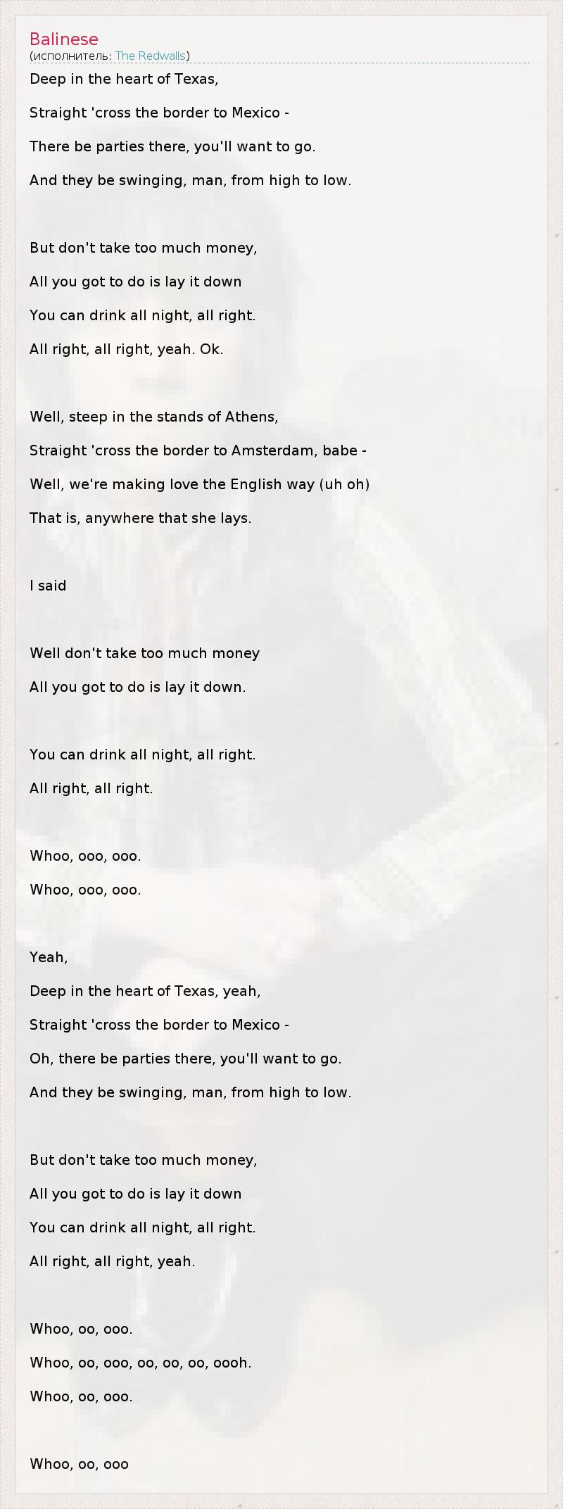Deep in the heart of Texas, Straight 'cross the border to Mexico - There be parties there, you'll want to go. And they be swinging, man, from high to low. But don't take too much money, All you got to do is lay it down You can drink all night, all right. All right, all right, yeah. Ok. Well, steep in the stands of Athens, Straight 'cross the border to Amsterdam, babe - Well, we're making love the English way (uh oh) That is, anywhere that she lays. I said Well don't take too much money All you got to do is lay it down. You can drink all night, all right. All right, all right. Whoo, ooo, ooo. Whoo, ooo, ooo. Yeah, Deep in the heart of Texas, yeah, Straight 'cross the border to Mexico - Oh, there be parties there, you'll want to go. And they be swinging, man, from high to low. But don't take too much money, All you got to do is lay it down You can drink all night, all right. All right, all right, yeah. Whoo, oo, ooo. Whoo, oo, ooo, oo, oo, oo, oooh. Whoo, oo, ooo. Whoo, oo, ooo