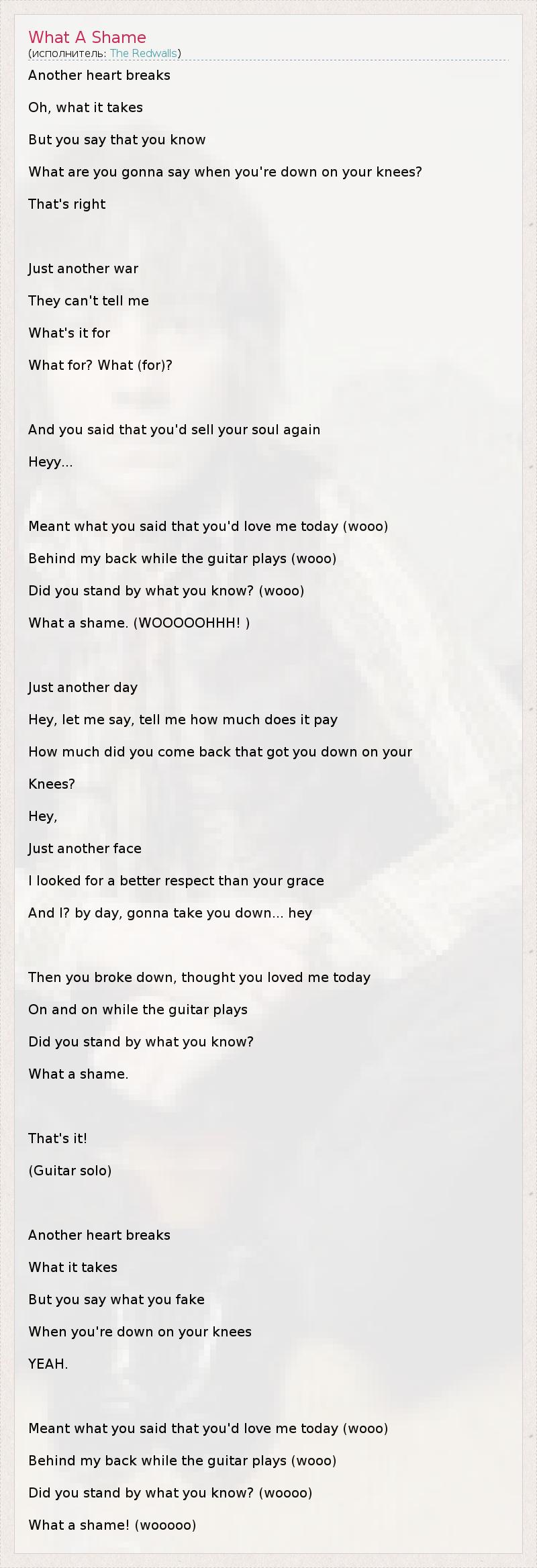 Another heart breaks Oh, what it takes But you say that you know What are you gonna say when you're down on your knees? That's right Just another war They can't tell me What's it for What for? What (for)? And you said that you'd sell your soul again Heyy... Meant what you said that you'd love me today (wooo) Behind my back while the guitar plays (wooo) Did you stand by what you know? (wooo) What a shame. (WOOOOOHHH! ) Just another day Hey, let me say, tell me how much does it pay How much did you come back that got you down on your Knees? Hey, Just another face I looked for a better respect than your grace And I? by day, gonna take you down... hey Then you broke down, thought you loved me today On and on while the guitar plays Did you stand by what you know? What a shame. That's it! (Guitar solo) Another heart breaks What it takes But you say what you fake When you're down on your knees YEAH. Meant what you said that you'd love me today (wooo) Behind my back while the guitar plays (wooo) Did you stand by what you know? (woooo) What a shame! (wooooo)