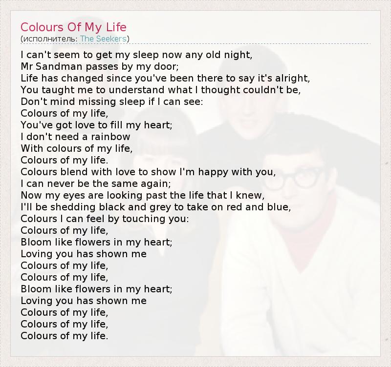 I can't seem to get my sleep now any old night, Mr Sandman passes by my door; Life has changed since you've been there to say it's alright, You taught me to understand what I thought couldn't be, Don't mind missing sleep if I can see: Colours of my life, You've got love to fill my heart; I don't need a rainbow With colours of my life, Colours of my life. Colours blend with love to show I'm happy with you, I can never be the same again; Now my eyes are looking past the life that I knew, I'll be shedding black and grey to take on red and blue, Colours I can feel by touching you: Colours of my life, Bloom like flowers in my heart; Loving you has shown me Colours of my life, Colours of my life, Bloom like flowers in my heart; Loving you has shown me Colours of my life, Colours of my life, Colours of my life.