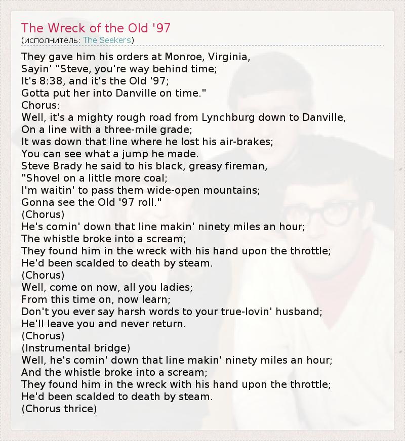 They gave him his orders at Monroe, Virginia, Sayin' "Steve, you're way behind time; It's 8:38, and it's the Old '97; Gotta put her into Danville on time." Chorus: Well, it's a mighty rough road from Lynchburg down to Danville, On a line with a three-mile grade; It was down that line where he lost his air-brakes; You can see what a jump he made. Steve Brady he said to his black, greasy fireman, "Shovel on a little more coal; I'm waitin' to pass them wide-open mountains; Gonna see the Old '97 roll." (Chorus) He's comin' down that line makin' ninety miles an hour; The whistle broke into a scream; They found him in the wreck with his hand upon the throttle; He'd been scalded to death by steam. (Chorus) Well, come on now, all you ladies; From this time on, now learn; Don't you ever say harsh words to your true-lovin' husband; He'll leave you and never return. (Chorus) (Instrumental bridge) Well, he's comin' down that line makin' ninety miles an hour; And the whistle broke into a scream; They found him in the wreck with his hand upon the throttle; He'd been scalded to death by steam. (Chorus thrice)