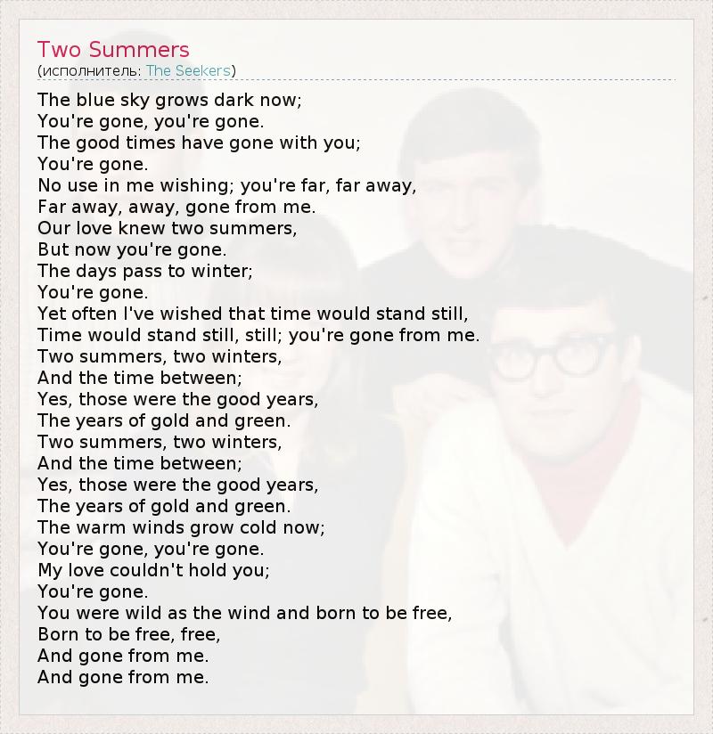 The blue sky grows dark now; You're gone, you're gone. The good times have gone with you; You're gone. No use in me wishing; you're far, far away, Far away, away, gone from me. Our love knew two summers, But now you're gone. The days pass to winter; You're gone. Yet often I've wished that time would stand still, Time would stand still, still; you're gone from me. Two summers, two winters, And the time between; Yes, those were the good years, The years of gold and green. Two summers, two winters, And the time between; Yes, those were the good years, The years of gold and green. The warm winds grow cold now; You're gone, you're gone. My love couldn't hold you; You're gone. You were wild as the wind and born to be free, Born to be free, free, And gone from me. And gone from me.