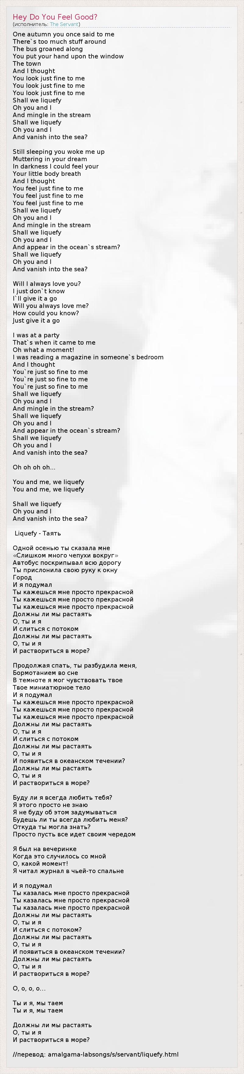 One autumn you once said to me There`s too much stuff around The bus groaned along You put your hand upon the window The town And I thought You look just fine to me You look just fine to me You look just fine to me Shall we liquefy Oh you and I And mingle in the stream Shall we liquefy Oh you and I And vanish into the sea? Still sleeping you woke me up Muttering in your dream In darkness I could feel your Your little body breath And I thought You feel just fine to me You feel just fine to me You feel just fine to me Shall we liquefy Oh you and I And mingle in the stream Shall we liquefy Oh you and I And appear in the ocean`s stream? Shall we liquefy Oh you and I And vanish into the sea? Will I always love you? I just don`t know I`ll give it a go Will you always love me? How could you know? Just give it a go I was at a party That`s when it came to me Oh what a moment! I was reading a magazine in someone`s bedroom And I thought You`re just so fine to me You`re just so fine to me You`re just so fine to me Shall we liquefy Oh you and I And mingle in the stream? Shall we liquefy Oh you and I And appear in the ocean`s stream? Shall we liquefy Oh you and I And vanish into the sea? Oh oh oh oh... You and me, we liquefy You and me, we liquefy Shall we liquefy Oh you and I And vanish into the sea? Liquefy - Таять Одной осенью ты сказала мне «Слишком много чепухи вокруг» Автобус поскрипывал всю дорогу Ты прислонила свою руку к окну Город И я подумал Ты кажешься мне просто прекрасной Ты кажешься мне просто прекрасной Ты кажешься мне просто прекрасной Должны ли мы растаять О, ты и я И слиться с потоком Должны ли мы растаять О, ты и я И раствориться в море? Продолжая спать, ты разбудила меня, Бормотанием во сне В темноте я мог чувствовать твое Твое миниатюрное тело И я подумал Ты кажешься мне просто прекрасной Ты кажешься мне просто прекрасной Ты кажешься мне просто прекрасной Должны ли мы растаять О, ты и я И слиться с потоком Должны ли мы растаять О, ты и я И появиться в океанском течении? Должны ли мы растаять О, ты и я И раствориться в море? Буду ли я всегда любить тебя? Я этого просто не знаю Я не буду об этом задумываться Будешь ли ты всегда любить меня? Откуда ты могла знать? Просто пусть все идет своим чередом Я был на вечеринке Когда это случилось со мной О, какой момент! Я читал журнал в чьей-то спальне И я подумал Ты казалась мне просто прекрасной Ты казалась мне просто прекрасной Ты казалась мне просто прекрасной Должны ли мы растаять О, ты и я И слиться с потоком? Должны ли мы растаять О, ты и я И появиться в океанском течении? Должны ли мы растаять О, ты и я И раствориться в море? О, о, о, о… Ты и я, мы таем Ты и я, мы таем Должны ли мы растаять О, ты и я И раствориться в море? //перевод: amalgama-labsongs/s/servant/liquefy.html