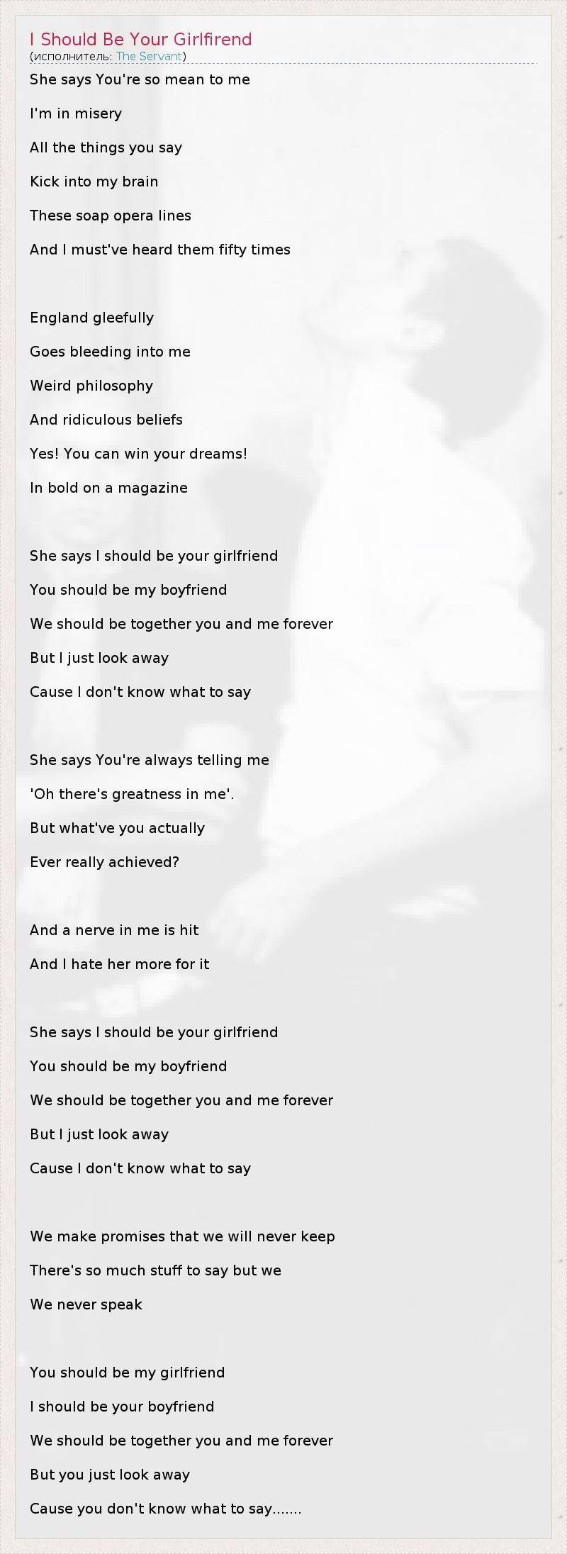 She says You're so mean to me I'm in misery All the things you say Kick into my brain These soap opera lines And I must've heard them fifty times England gleefully Goes bleeding into me Weird philosophy And ridiculous beliefs Yes! You can win your dreams! In bold on a magazine She says I should be your girlfriend You should be my boyfriend We should be together you and me forever But I just look away Cause I don't know what to say She says You're always telling me 'Oh there's greatness in me'. But what've you actually Ever really achieved? And a nerve in me is hit And I hate her more for it She says I should be your girlfriend You should be my boyfriend We should be together you and me forever But I just look away Cause I don't know what to say We make promises that we will never keep There's so much stuff to say but we We never speak You should be my girlfriend I should be your boyfriend We should be together you and me forever But you just look away Cause you don't know what to say.......