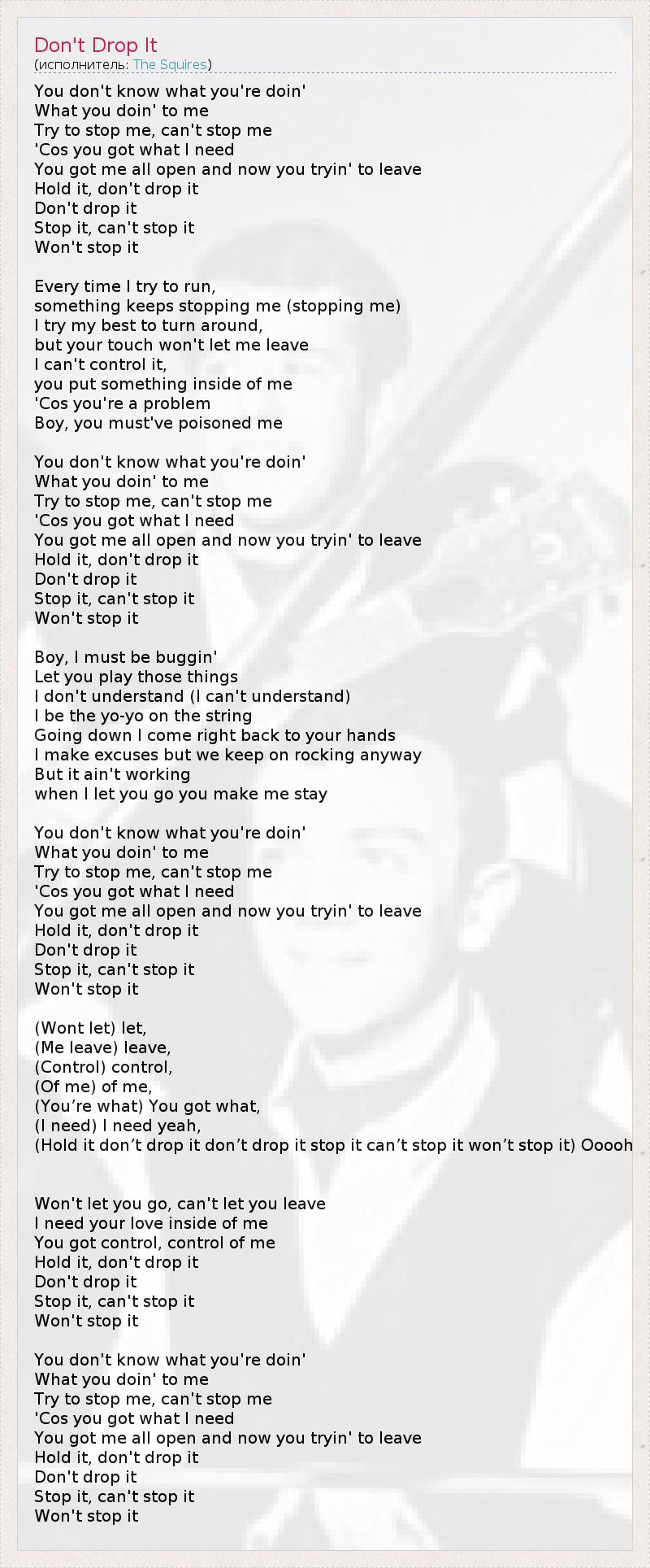 You don't know what you're doin' What you doin' to me Try to stop me, can't stop me 'Cos you got what I need You got me all open and now you tryin' to leave Hold it, don't drop it Don't drop it Stop it, can't stop it Won't stop it Every time I try to run, something keeps stopping me (stopping me) I try my best to turn around, but your touch won't let me leave I can't control it, you put something inside of me 'Cos you're a problem Boy, you must've poisoned me You don't know what you're doin' What you doin' to me Try to stop me, can't stop me 'Cos you got what I need You got me all open and now you tryin' to leave Hold it, don't drop it Don't drop it Stop it, can't stop it Won't stop it Boy, I must be buggin' Let you play those things I don't understand (I can't understand) I be the yo-yo on the string Going down I come right back to your hands I make excuses but we keep on rocking anyway But it ain't working when I let you go you make me stay You don't know what you're doin' What you doin' to me Try to stop me, can't stop me 'Cos you got what I need You got me all open and now you tryin' to leave Hold it, don't drop it Don't drop it Stop it, can't stop it Won't stop it (Wont let) let, (Me leave) leave, (Control) control, (Of me) of me, (You’re what) You got what, (I need) I need yeah, (Hold it don’t drop it don’t drop it stop it can’t stop it won’t stop it) Ooooh Won't let you go, can't let you leave I need your love inside of me You got control, control of me Hold it, don't drop it Don't drop it Stop it, can't stop it Won't stop it You don't know what you're doin' What you doin' to me Try to stop me, can't stop me 'Cos you got what I need You got me all open and now you tryin' to leave Hold it, don't drop it Don't drop it Stop it, can't stop it Won't stop it