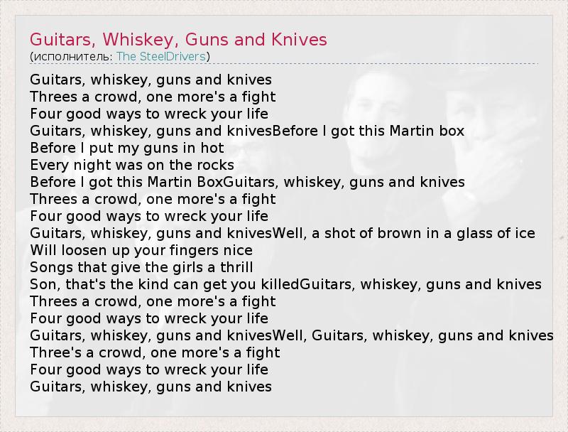 А как ты думаешь, о чем песня "Guitars, Whiskey, Guns and Knives" ?