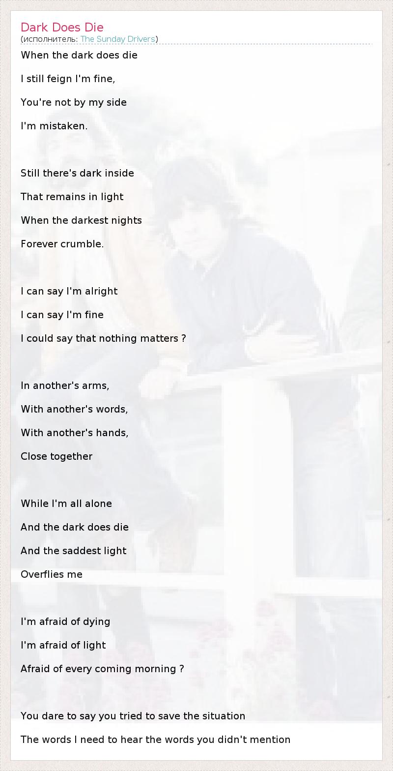 When the dark does die I still feign I'm fine, You're not by my side I'm mistaken. Still there's dark inside That remains in light When the darkest nights Forever crumble. I can say I'm alright I can say I'm fine I could say that nothing matters ? In another's arms, With another's words, With another's hands, Close together While I'm all alone And the dark does die And the saddest light Overflies me I'm afraid of dying I'm afraid of light Afraid of every coming morning ? You dare to say you tried to save the situation The words I need to hear the words you didn't mention