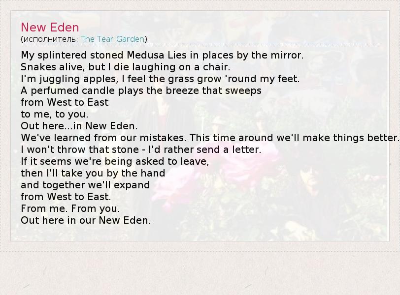 My splintered stoned Medusa Lies in places by the mirror. Snakes alive, but I die laughing on a chair. I'm juggling apples, I feel the grass grow 'round my feet. A perfumed candle plays the breeze that sweeps from West to East to me, to you. Out here...in New Eden. We've learned from our mistakes. This time around we'll make things better. I won't throw that stone - I'd rather send a letter. If it seems we're being asked to leave, then I'll take you by the hand and together we'll expand from West to East. From me. From you. Out here in our New Eden.