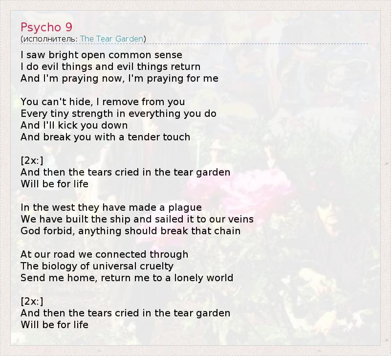 I saw bright open common sense I do evil things and evil things return And I'm praying now, I'm praying for me You can't hide, I remove from you Every tiny strength in everything you do And I'll kick you down And break you with a tender touch [2x:] And then the tears cried in the tear garden Will be for life In the west they have made a plague We have built the ship and sailed it to our veins God forbid, anything should break that chain At our road we connected through The biology of universal cruelty Send me home, return me to a lonely world [2x:] And then the tears cried in the tear garden Will be for life