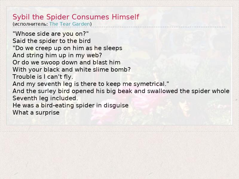 А как ты думаешь, о чем песня "Sybil the Spider Consumes Himself" ?