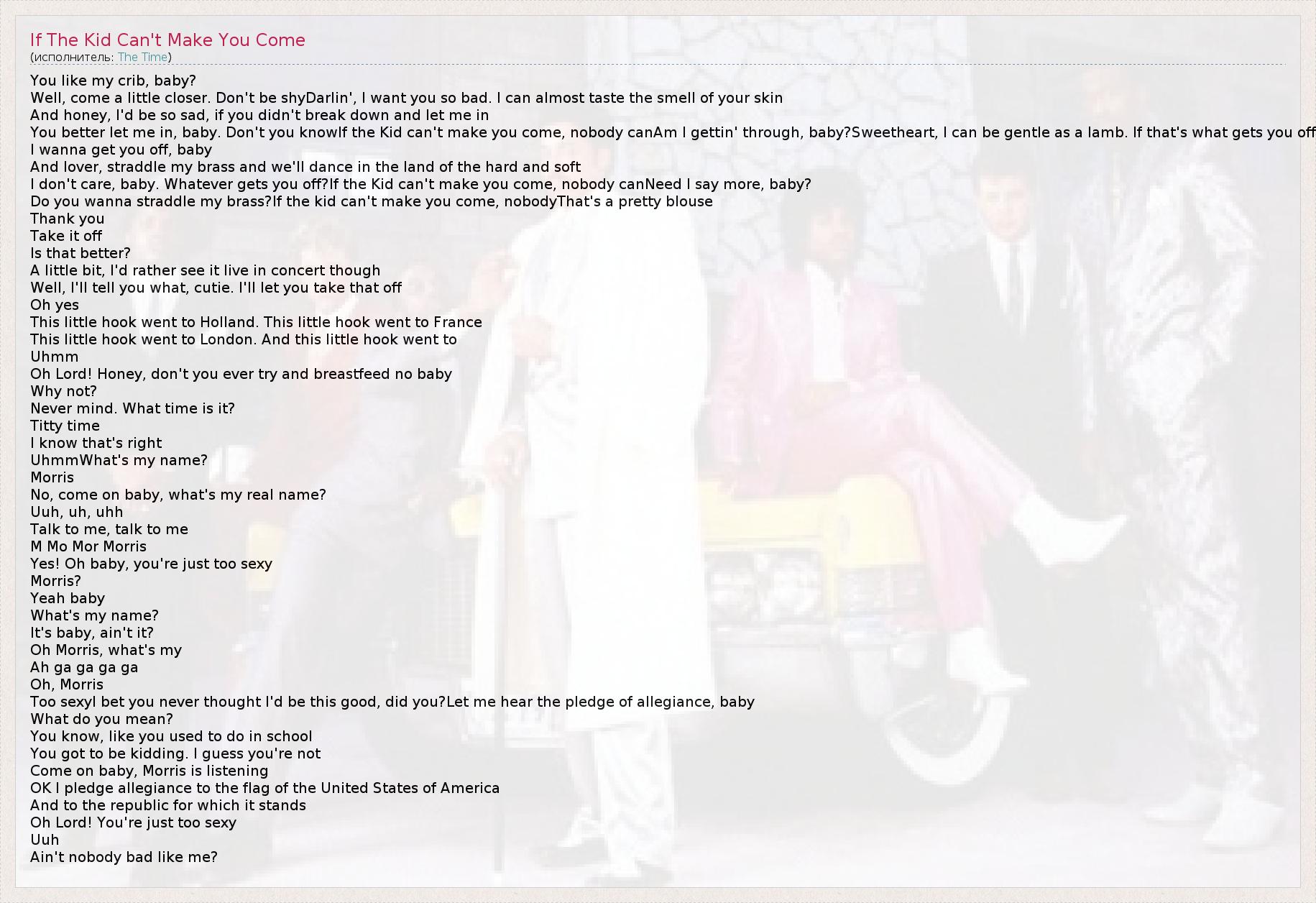 You like my crib, baby? Well, come a little closer. Don't be shyDarlin', I want you so bad. I can almost taste the smell of your skin And honey, I'd be so sad, if you didn't break down and let me in You better let me in, baby. Don't you knowIf the Kid can't make you come, nobody canAm I gettin' through, baby?Sweetheart, I can be gentle as a lamb. If that's what gets you off I wanna get you off, baby And lover, straddle my brass and we'll dance in the land of the hard and soft I don't care, baby. Whatever gets you off?If the Kid can't make you come, nobody canNeed I say more, baby? Do you wanna straddle my brass?If the kid can't make you come, nobodyThat's a pretty blouse Thank you Take it off Is that better? A little bit, I'd rather see it live in concert though Well, I'll tell you what, cutie. I'll let you take that off Oh yes This little hook went to Holland. This little hook went to France This little hook went to London. And this little hook went to Uhmm Oh Lord! Honey, don't you ever try and breastfeed no baby Why not? Never mind. What time is it? Titty time I know that's right UhmmWhat's my name? Morris No, come on baby, what's my real name? Uuh, uh, uhh Talk to me, talk to me M Mo Mor Morris Yes! Oh baby, you're just too sexy Morris? Yeah baby What's my name? It's baby, ain't it? Oh Morris, what's my Ah ga ga ga ga Oh, Morris Too sexyI bet you never thought I'd be this good, did you?Let me hear the pledge of allegiance, baby What do you mean? You know, like you used to do in school You got to be kidding. I guess you're not Come on baby, Morris is listening OK I pledge allegiance to the flag of the United States of America And to the republic for which it stands Oh Lord! You're just too sexy Uuh Ain't nobody bad like me?