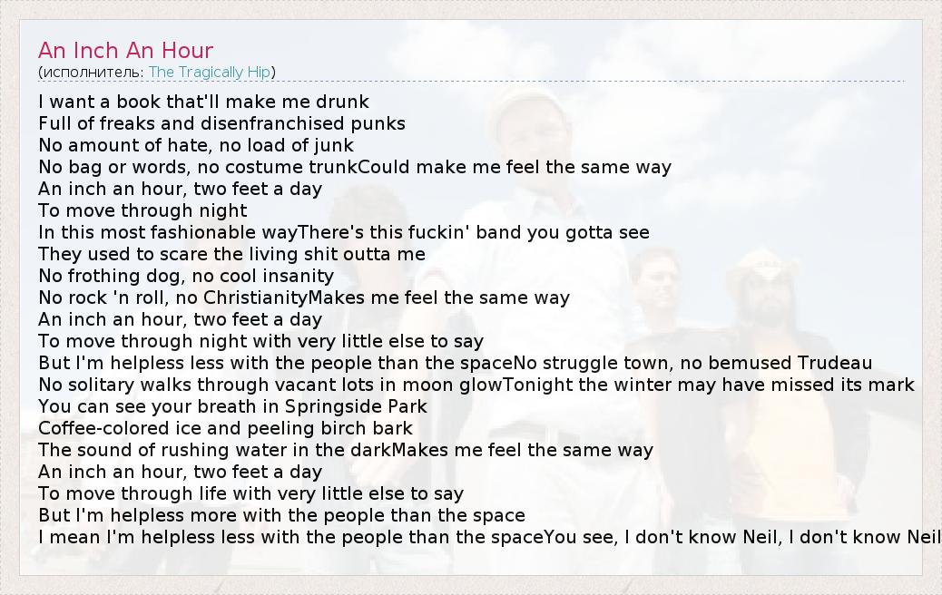 I want a book that'll make me drunk Full of freaks and disenfranchised punks No amount of hate, no load of junk No bag or words, no costume trunkCould make me feel the same way An inch an hour, two feet a day To move through night In this most fashionable wayThere's this fuckin' band you gotta see They used to scare the living shit outta me No frothing dog, no cool insanity No rock 'n roll, no ChristianityMakes me feel the same way An inch an hour, two feet a day To move through night with very little else to say But I'm helpless less with the people than the spaceNo struggle town, no bemused Trudeau No solitary walks through vacant lots in moon glowTonight the winter may have missed its mark You can see your breath in Springside Park Coffee-colored ice and peeling birch bark The sound of rushing water in the darkMakes me feel the same way An inch an hour, two feet a day To move through life with very little else to say But I'm helpless more with the people than the space I mean I'm helpless less with the people than the spaceYou see, I don't know Neil, I don't know Neil