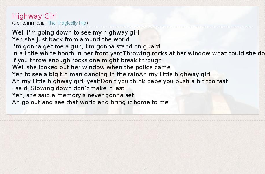 А как ты думаешь, о чем песня "Highway Girl" ?