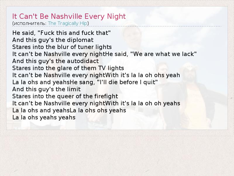 А как ты думаешь, о чем песня "It Can't Be Nashville Every Night" ?