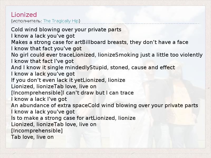 Это интересно:The Tragically Hip (часто просто The Hip) — канадская рок-группа, выступающая с 1983 года. За время существования The Tragically Hip выпустили 12 студийных и два концертных альбома и 46 синглов. Девять альбомов группы возглавляли канадские хит-парады, среди ее многочисленных наград 12 премий «Джуно» и Премия генерал-губернатора за карьерные достижения в области искусства.Группа сформировалась в 1983 году... продолжение