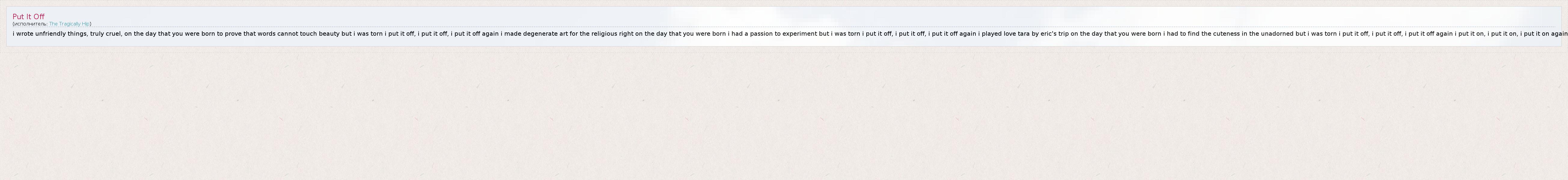 i wrote unfriendly things, truly cruel, on the day that you were born to prove that words cannot touch beauty but i was torn i put it off, i put it off, i put it off again i made degenerate art for the religious right on the day that you were born i had a passion to experiment but i was torn i put it off, i put it off, i put it off again i played love tara by eric's trip on the day that you were born i had to find the cuteness in the unadorned but i was torn i put it off, i put it off, i put it off again i put it on, i put it on, i put it on again