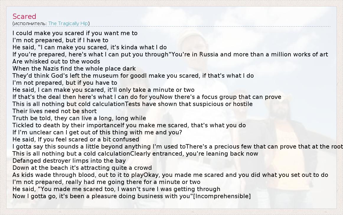 Это интересно:The Tragically Hip (часто просто The Hip) — канадская рок-группа, выступающая с 1983 года. За время существования The Tragically Hip выпустили 12 студийных и два концертных альбома и 46 синглов. Девять альбомов группы возглавляли канадские хит-парады, среди ее многочисленных наград 12 премий «Джуно» и Премия генерал-губернатора за карьерные достижения в области искусства.Группа сформировалась в 1983 году... продолжение
