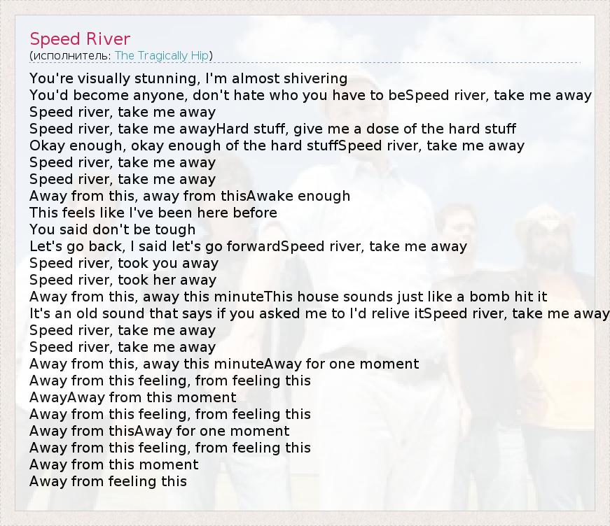 Okay enough, okay enough of the hard stuffSpeed river, take me away
