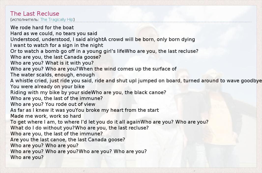 We rode hard for the boat Hard as we could, no tears you said Understood, understood, I said alrightA crowd will be born, only born dying I want to watch for a sign in the night Or to watch a bomb go off in a young girl's lifeWho are you, the last recluse? Who are you, the last Canada goose? Who are you? What is it with you? Who are you? Who are you?When the wind comes up the surface of The water scalds, enough, enough A whistle cried, just ride you said, ride and shut upI jumped on board, turned around to wave goodbye You were already on your bike Riding with my bike by your sideWho are you, the black canoe? Who are you, the last of the immune? Who are you? You rode out of view As far as I knew it was youYou broke my heart from the start Made me work, work so hard To get where I am, to where I'd let you do it all againWho are you? Who are you? What do I do without you?Who are you, the last recluse? Who are you, the last of the immune? Are you the last canoe, the last Canada goose? Who are you? Who are you? Who are you? Who are you?Who are you? Who are you? Who are you?