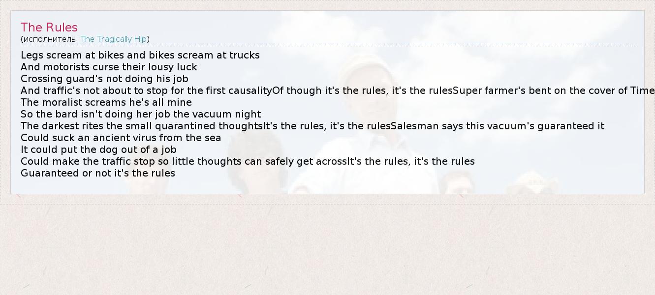 Это интересно:The Tragically Hip (часто просто The Hip) — канадская рок-группа, выступающая с 1983 года. За время существования The Tragically Hip выпустили 12 студийных и два концертных альбома и 46 синглов. Девять альбомов группы возглавляли канадские хит-парады, среди ее многочисленных наград 12 премий «Джуно» и Премия генерал-губернатора за карьерные достижения в области искусства.Группа сформировалась в 1983 году... продолжение