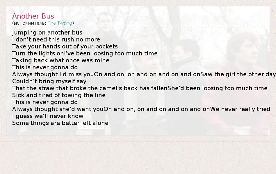 Jumping on another bus I don't need this rush no more Take your hands out of your pockets Turn the lights onI've been loosing too much time Taking back what once was mine This is never gonna do Always thought I'd miss youOn and on, on and on and on and onSaw the girl the other day Couldn't bring myself say That the straw that broke the camel's back has fallenShe'd been loosing too much time Sick and tired of towing the line This is never gonna do Always thought she'd want youOn and on, on and on and on and onWe never really tried I guess we'll never know Some things are better left alone