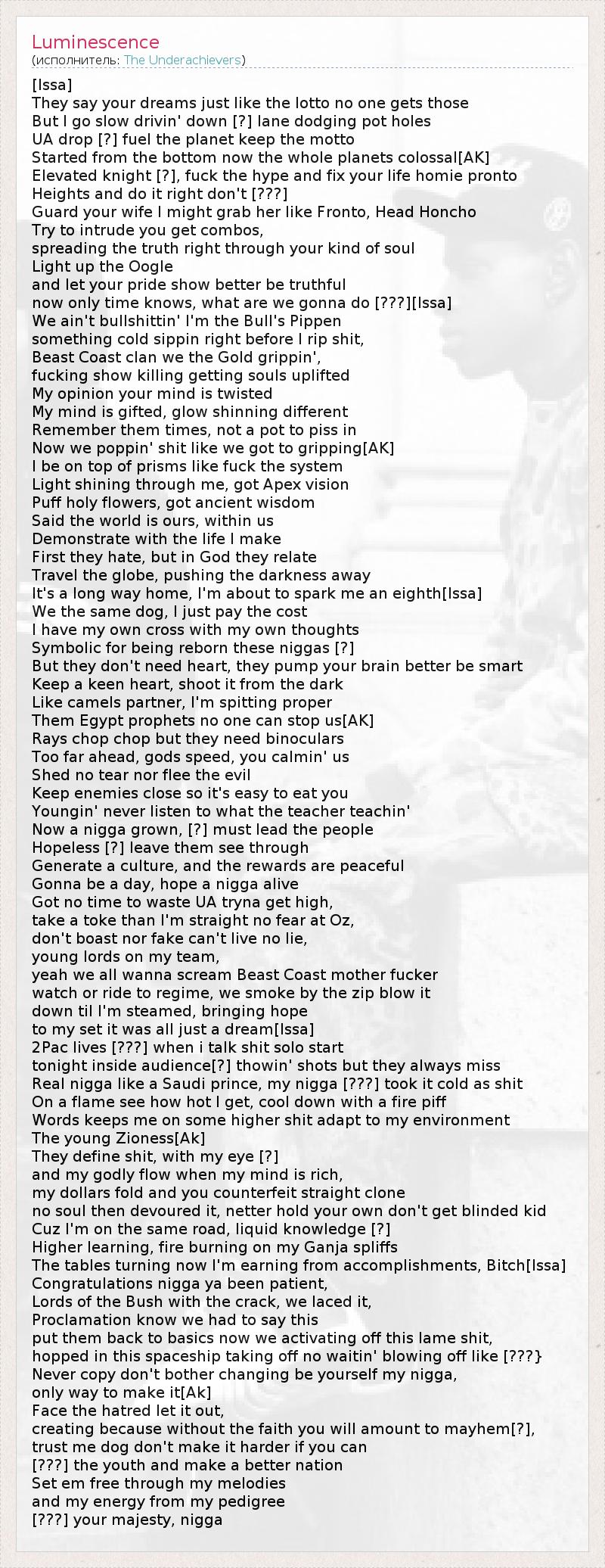 [Issa] They say your dreams just like the lotto no one gets those But I go slow drivin' down [?] lane dodging pot holes UA drop [?] fuel the planet keep the motto Started from the bottom now the whole planets colossal[AK] Elevated knight [?], fuck the hype and fix your life homie pronto Heights and do it right don't [???] Guard your wife I might grab her like Fronto, Head Honcho Try to intrude you get combos, spreading the truth right through your kind of soul Light up the Oogle and let your pride show better be truthful now only time knows, what are we gonna do [???][Issa] We ain't bullshittin' I'm the Bull's Pippen something cold sippin right before I rip shit, Beast Coast clan we the Gold grippin', fucking show killing getting souls uplifted My opinion your mind is twisted My mind is gifted, glow shinning different Remember them times, not a pot to piss in Now we poppin' shit like we got to gripping[AK] I be on top of prisms like fuck the system Light shining through me, got Apex vision Puff holy flowers, got ancient wisdom Said the world is ours, within us Demonstrate with the life I make First they hate, but in God they relate Travel the globe, pushing the darkness away It's a long way home, I'm about to spark me an eighth[Issa] We the same dog, I just pay the cost I have my own cross with my own thoughts Symbolic for being reborn these niggas [?] But they don't need heart, they pump your brain better be smart Keep a keen heart, shoot it from the dark Like camels partner, I'm spitting proper Them Egypt prophets no one can stop us[AK] Rays chop chop but they need binoculars Too far ahead, gods speed, you calmin' us Shed no tear nor flee the evil Keep enemies close so it's easy to eat you Youngin' never listen to what the teacher teachin' Now a nigga grown, [?] must lead the people Hopeless [?] leave them see through Generate a culture, and the rewards are peaceful Gonna be a day, hope a nigga alive Got no time to waste UA tryna get high, take a toke than I'm straight no fear at Oz, don't boast nor fake can't live no lie, young lords on my team, yeah we all wanna scream Beast Coast mother fucker watch or ride to regime, we smoke by the zip blow it down til I'm steamed, bringing hope to my set it was all just a dream[Issa] 2Pac lives [???] when i talk shit solo start tonight inside audience[?] thowin' shots but they always miss Real nigga like a Saudi prince, my nigga [???] took it cold as shit On a flame see how hot I get, cool down with a fire piff Words keeps me on some higher shit adapt to my environment The young Zioness[Ak] They define shit, with my eye [?] and my godly flow when my mind is rich, my dollars fold and you counterfeit straight clone no soul then devoured it, netter hold your own don't get blinded kid Cuz I'm on the same road, liquid knowledge [?] Higher learning, fire burning on my Ganja spliffs The tables turning now I'm earning from accomplishments, Bitch[Issa] Congratulations nigga ya been patient, Lords of the Bush with the crack, we laced it, Proclamation know we had to say this put them back to basics now we activating off this lame shit, hopped in this spaceship taking off no waitin' blowing off like [???} Never copy don't bother changing be yourself my nigga, only way to make it[Ak] Face the hatred let it out, creating because without the faith you will amount to mayhem[?], trust me dog don't make it harder if you can [???] the youth and make a better nation Set em free through my melodies and my energy from my pedigree [???] your majesty, nigga