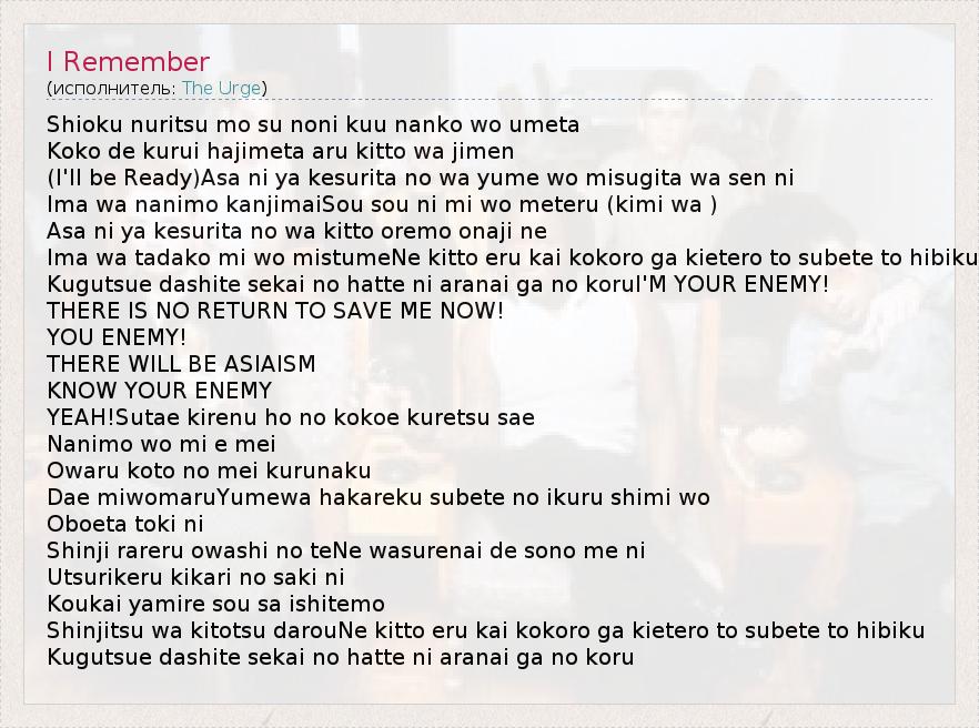Shioku nuritsu mo su noni kuu nanko wo umeta Koko de kurui hajimeta aru kitto wa jimen (I'll be Ready)Asa ni ya kesurita no wa yume wo misugita wa sen ni Ima wa nanimo kanjimaiSou sou ni mi wo meteru (kimi wa ) Asa ni ya kesurita no wa kitto oremo onaji ne Ima wa tadako mi wo mistumeNe kitto eru kai kokoro ga kietero to subete to hibiku Kugutsue dashite sekai no hatte ni aranai ga no koruI'M YOUR ENEMY! THERE IS NO RETURN TO SAVE ME NOW! YOU ENEMY! THERE WILL BE ASIAISM KNOW YOUR ENEMY YEAH!Sutae kirenu ho no kokoe kuretsu sae Nanimo wo mi e mei Owaru koto no mei kurunaku Dae miwomaruYumewa hakareku subete no ikuru shimi wo Oboeta toki ni Shinji rareru owashi no teNe wasurenai de sono me ni Utsurikeru kikari no saki ni Koukai yamire sou sa ishitemo Shinjitsu wa kitotsu darouNe kitto eru kai kokoro ga kietero to subete to hibiku Kugutsue dashite sekai no hatte ni aranai ga no koru