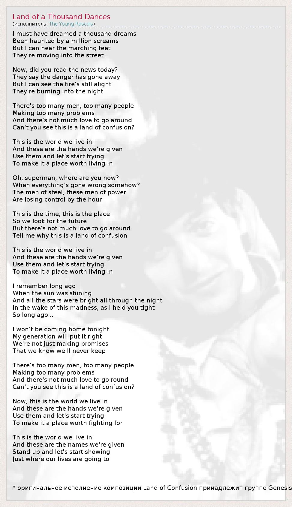 I must have dreamed a thousand dreams Been haunted by a million screams But I can hear the marching feet They're moving into the street Now, did you read the news today? They say the danger has gone away But I can see the fire's still alight They're burning into the night There's too many men, too many people Making too many problems And there's not much love to go around Can't you see this is a land of confusion? This is the world we live in And these are the hands we're given Use them and let's start trying To make it a place worth living in Oh, superman, where are you now? When everything's gone wrong somehow? The men of steel, these men of power Are losing control by the hour This is the time, this is the place So we look for the future But there's not much love to go around Tell me why this is a land of confusion This is the world we live in And these are the hands we're given Use them and let's start trying To make it a place worth living in I remember long ago When the sun was shining And all the stars were bright all through the night In the wake of this madness, as I held you tight So long ago... I won't be coming home tonight My generation will put it right We're not just making promises That we know we'll never keep There's too many men, too many people Making too many problems And there's not much love to go round Can't you see this is a land of confusion? Now, this is the world we live in And these are the hands we're given Use them and let's start trying To make it a place worth fighting for This is the world we live in And these are the names we're given Stand up and let's start showing Just where our lives are going to * оригинальное исполнение композиции Land of Confusion принадлежит группе Genesis